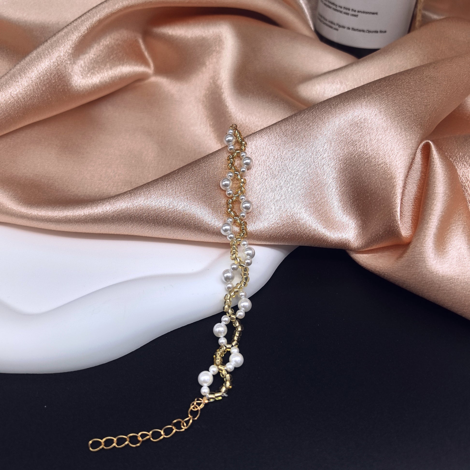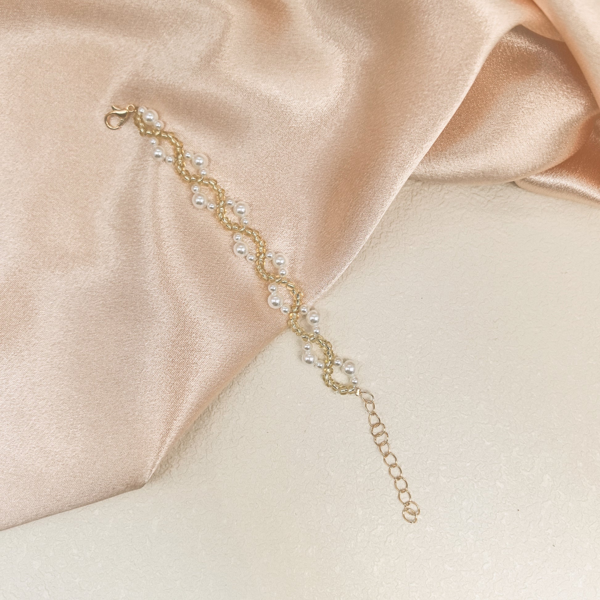- This exquisite handcrafted bracelet is a perfect blend of elegance and simplicity, designed to enhance any outfit with its timeless beauty. The bracelet features a delicate weave of gold bead and lustrous white pearls, creating a harmonious and sophisticated pattern that exudes grace and refinement.