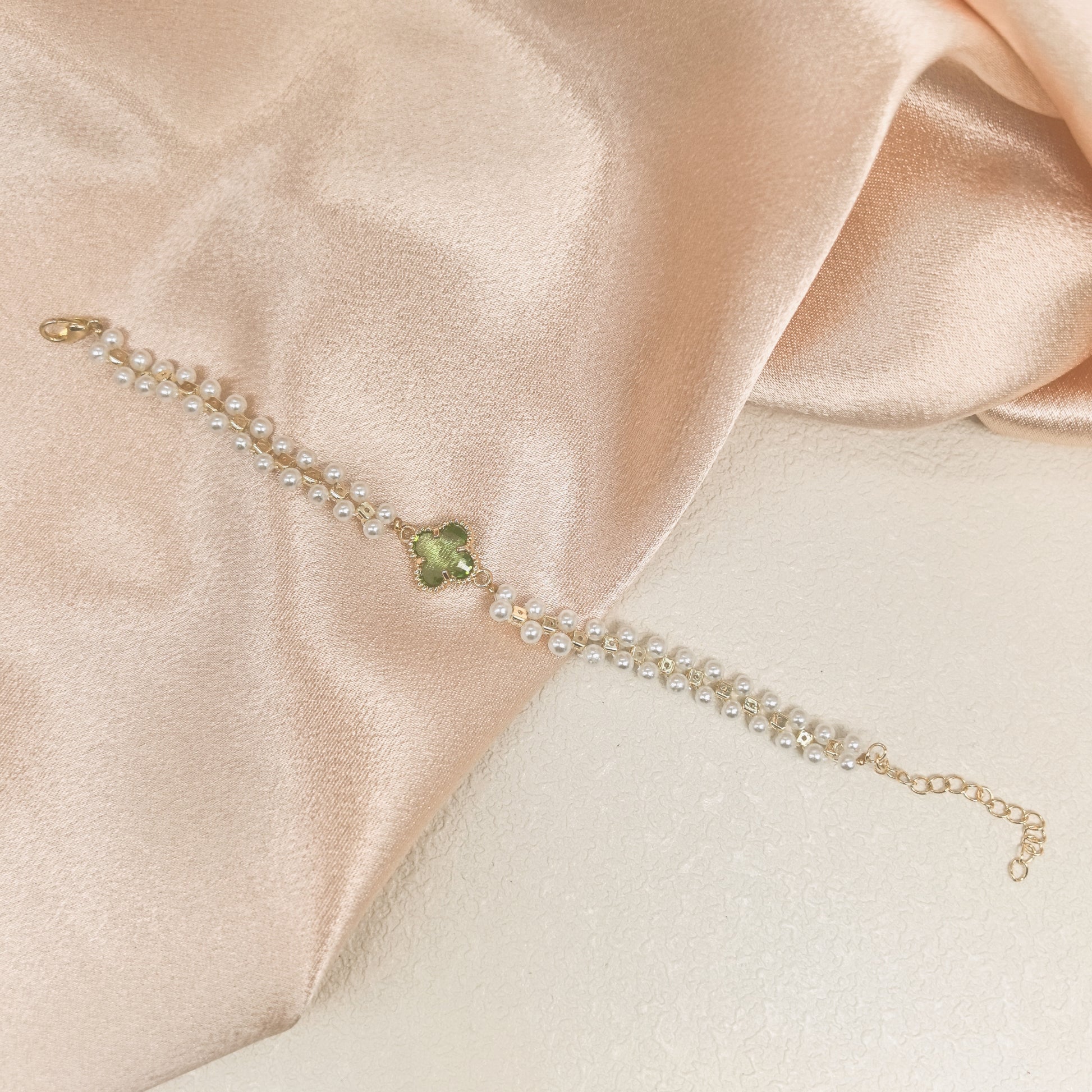 - The centerpiece of the bracelet is a delicate gold clover charm, adorned with a touch of green enamel, symbolizing good luck and prosperity. This charming detail adds a unique and personal touch to the bracelet, making it a standout piece. The gold accents throughout the bracelet provide a warm contrast to the silver-toned pearls, enhancing the overall aesthetic with a touch of luxury. A secure lobster clasp ensures the bracelet stays in place, providing both style and comfort.