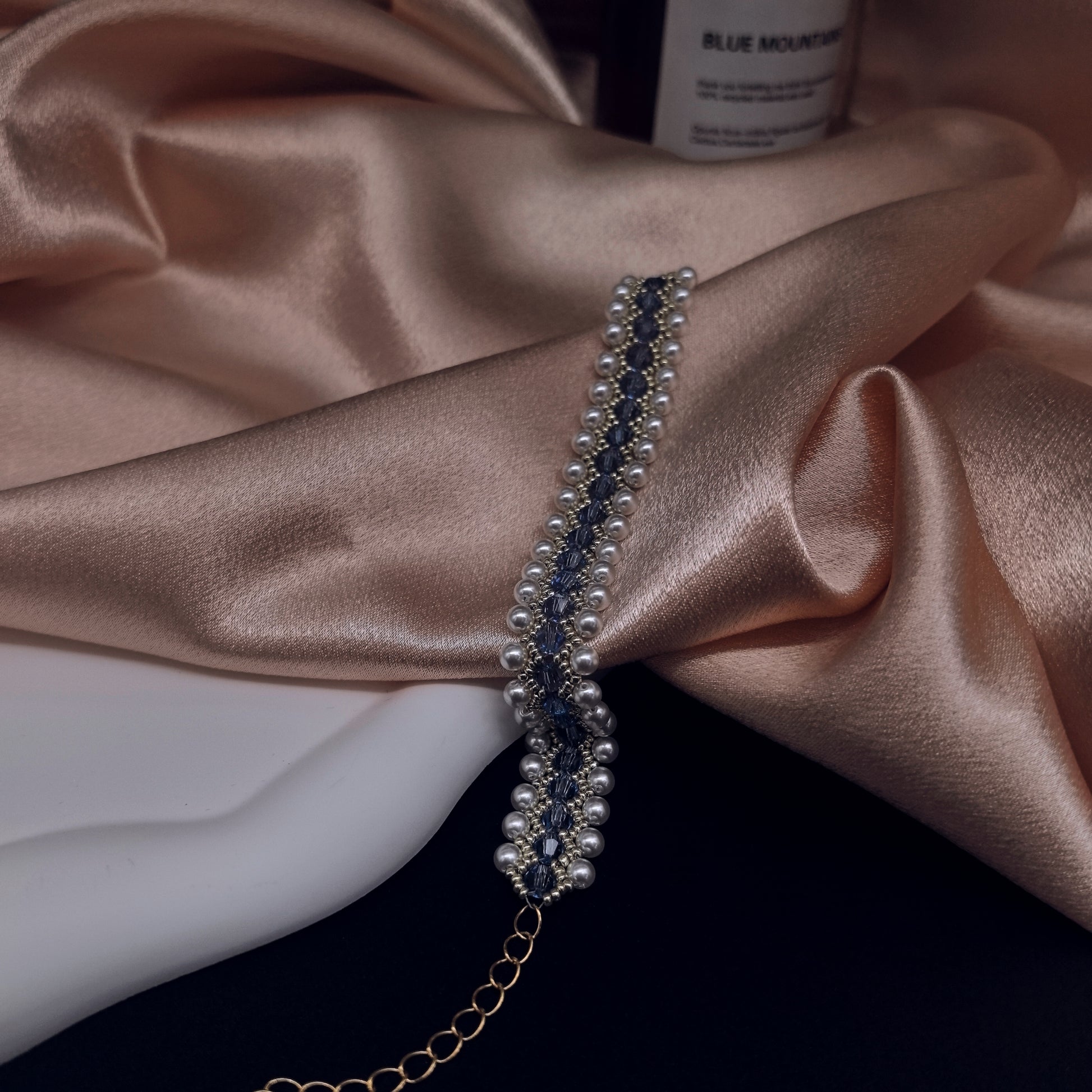 - This exquisite handcrafted bracelet is a true masterpiece of artisanal craftsmanship, combining elegance and sophistication in every detail. The design features a stunning array of lustrous pearls and deep blue sapphire beads, meticulously woven together to create a harmonious and luxurious pattern. The pearls provide a soft, elegant base, while the vibrant sapphires add a touch of boldness and color, making this bracelet a standout piece.