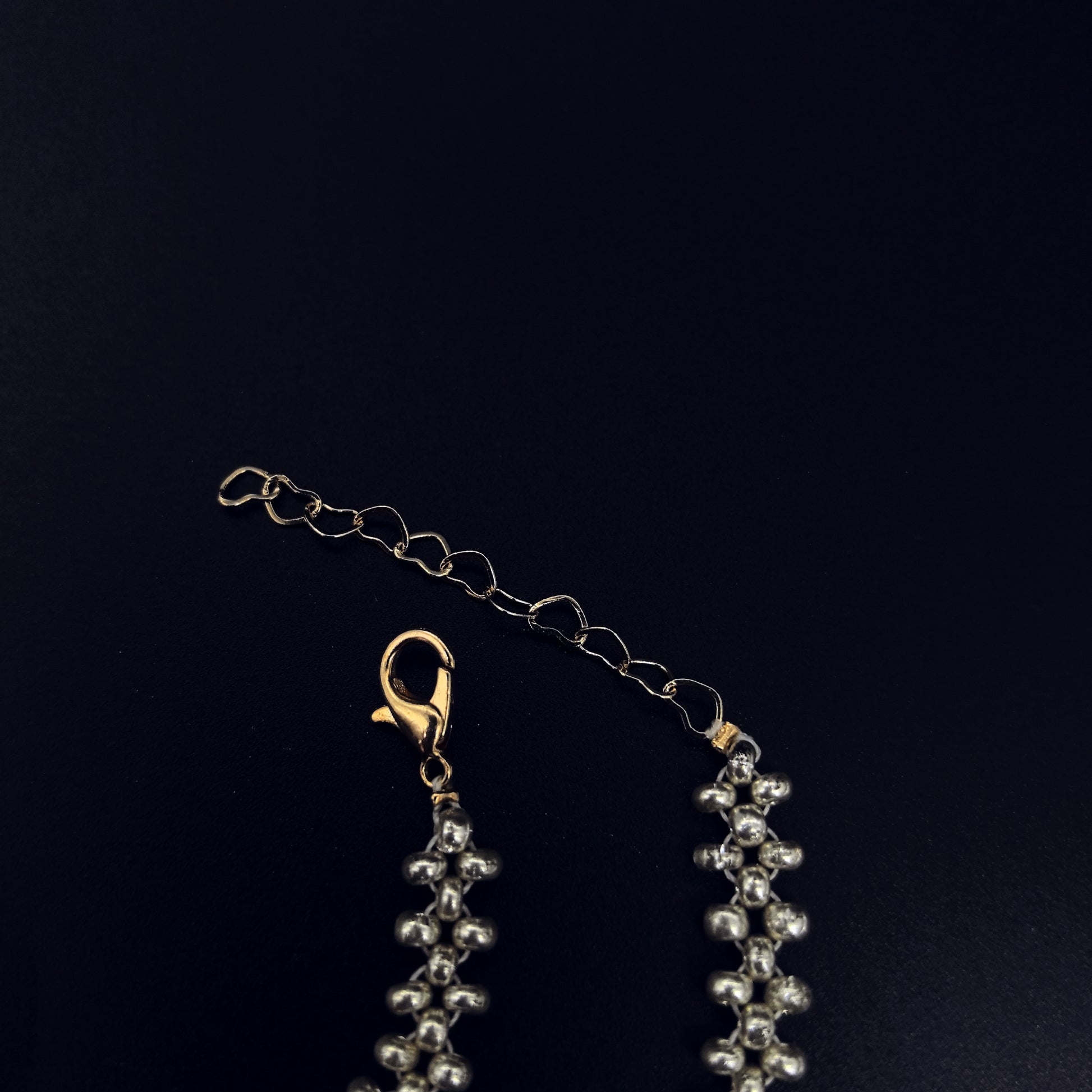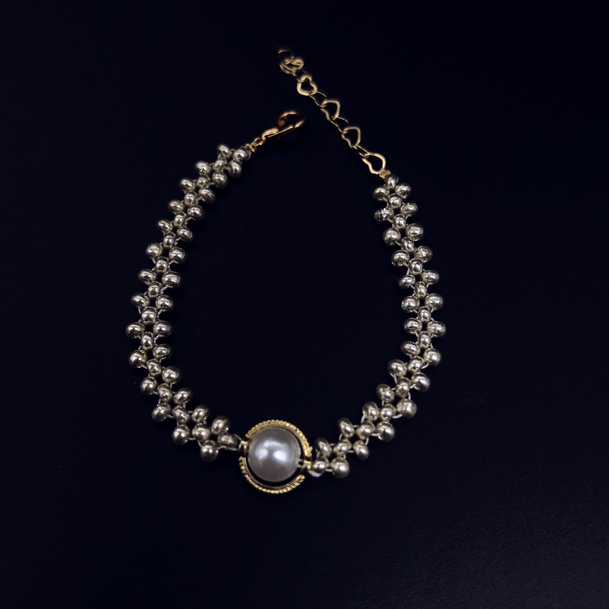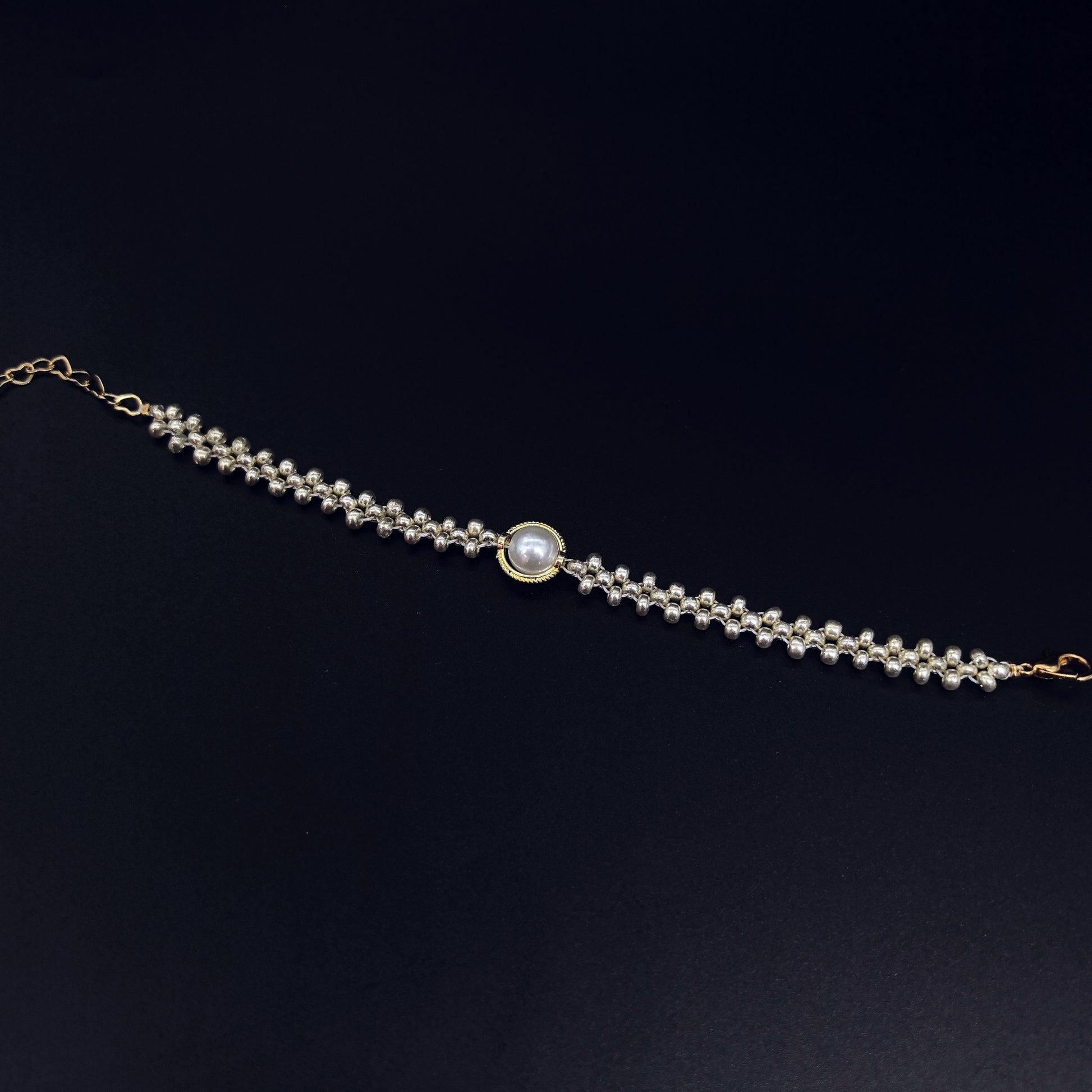 - Beads: The bracelet features a combination of small silver-toned beads arranged in a delicate pattern.