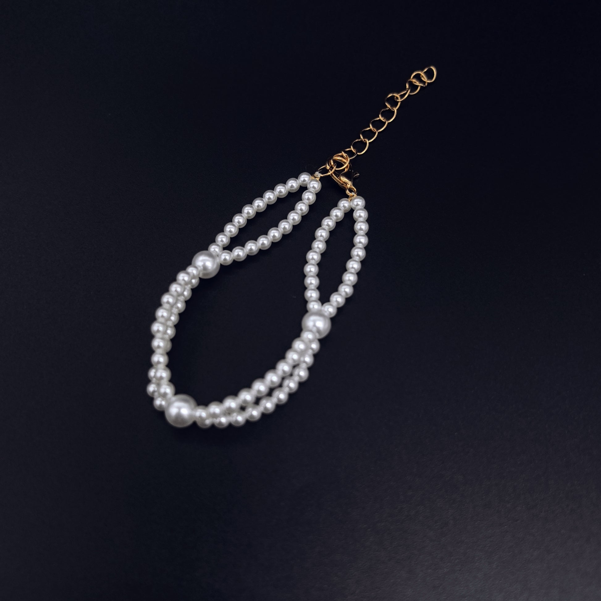 - Beads: The bracelet features a combination of small and large white faux pearls, arranged in a visually appealing pattern.