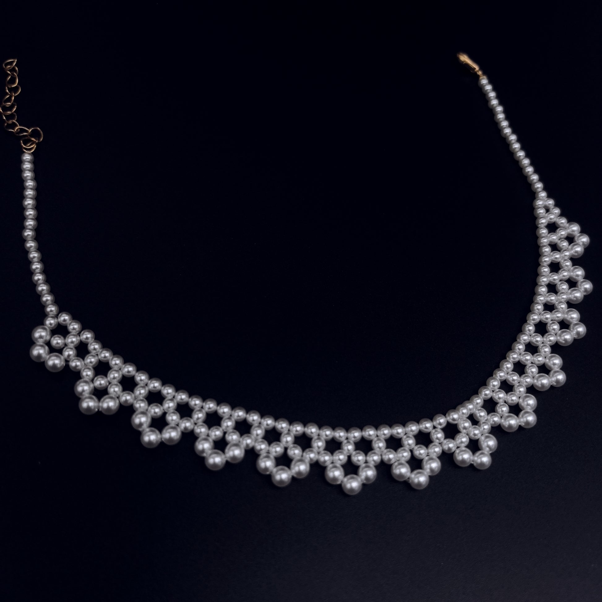 - The necklace's centerpiece is an intricate arrangement of smaller pearls that form delicate arches, adding depth and visual interest to the design. This pattern is repeated along the length of the necklace, creating a harmonious and balanced look. The gold chain on either side provides a classic touch, enhancing the overall aesthetic and providing a secure closure with a lobster clasp.