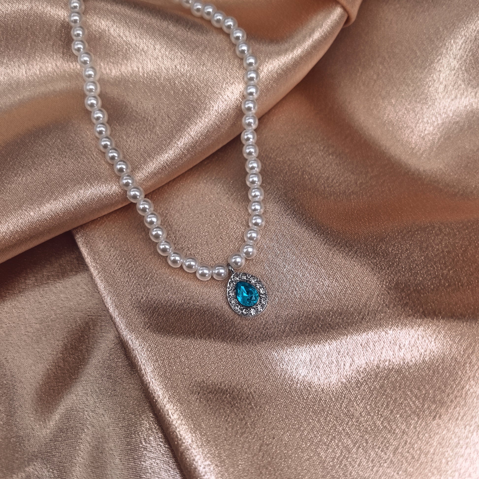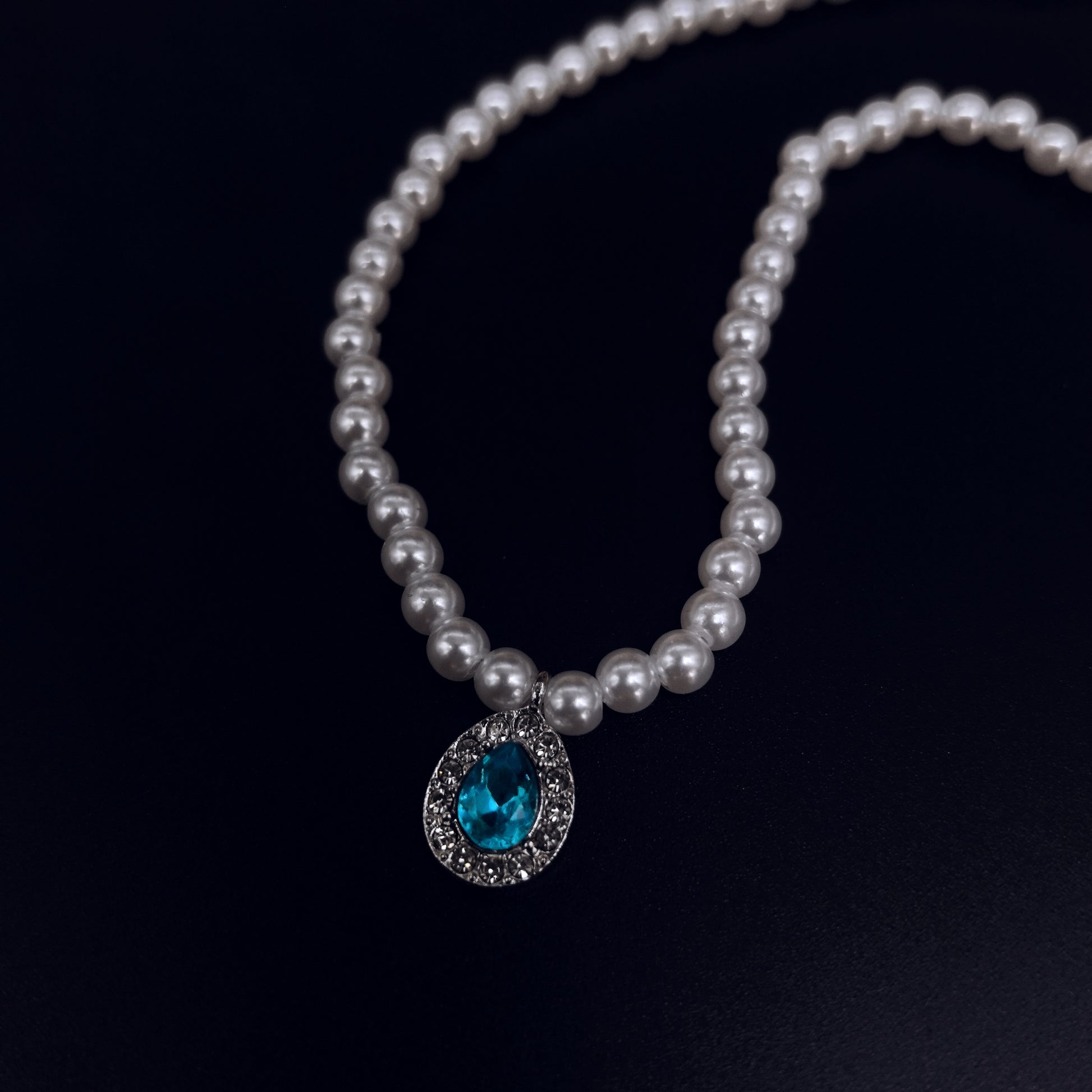 Elegant Pearl Necklace with Blue Crystal Pendant