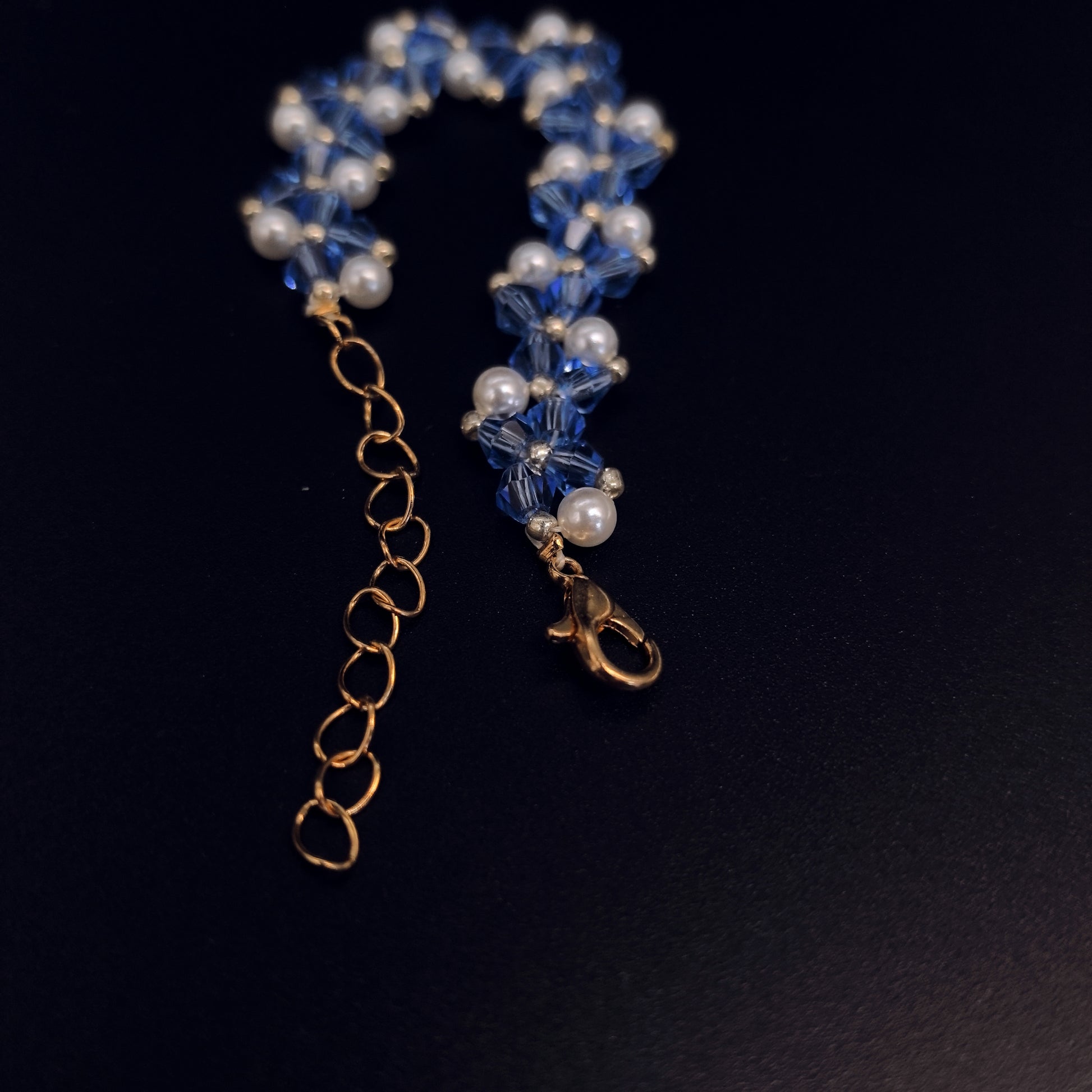 Add a touch of timeless elegance to your wardrobe with this beautifully crafted blue crystal and pearl bracelet. Whether you're dressing up for a special occasion or simply enhancing your everyday style, this bracelet is sure to become a cherished piece in your jewelry collection.