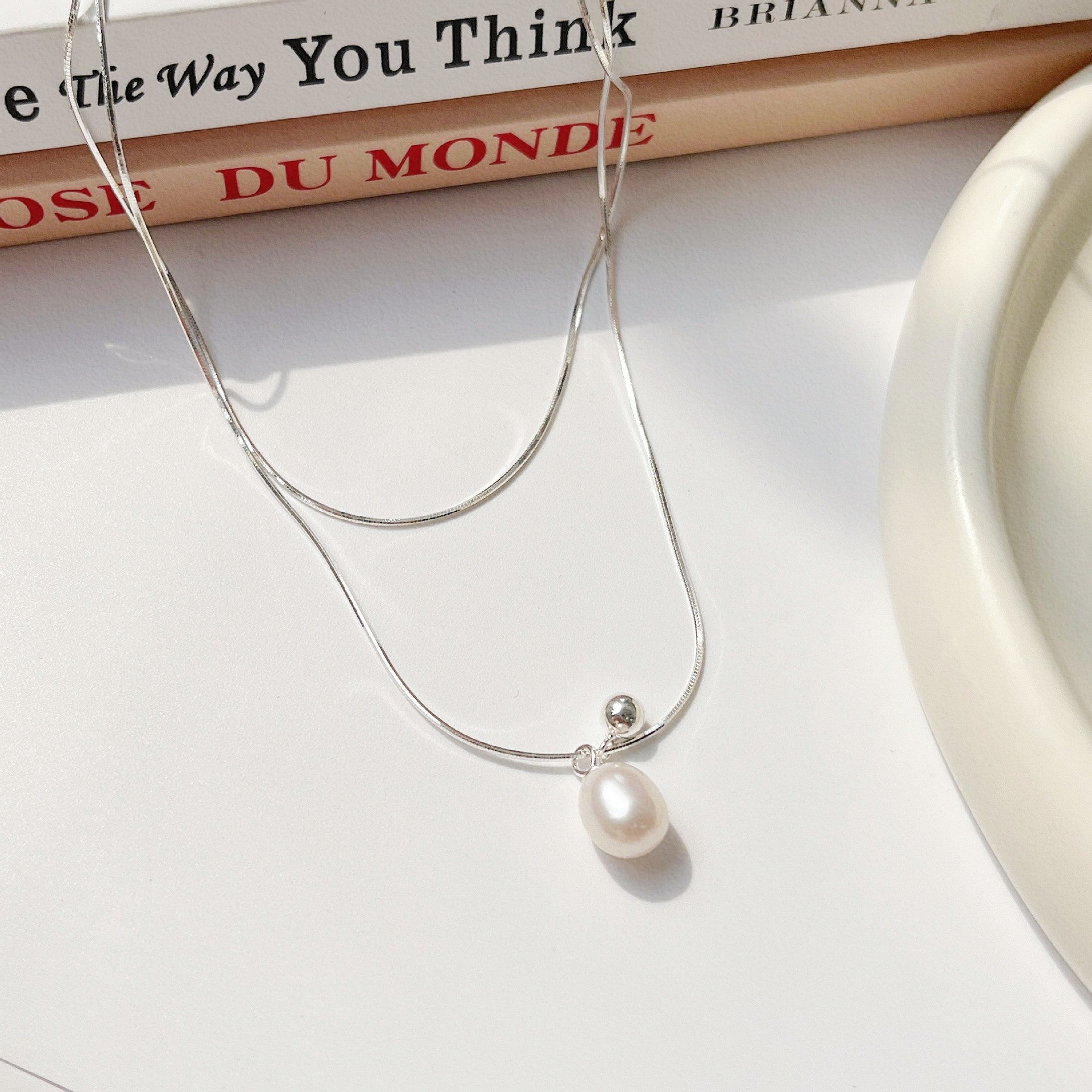 S925 Pearl Layered Pendant Necklace Choker Snake Chain Necklace