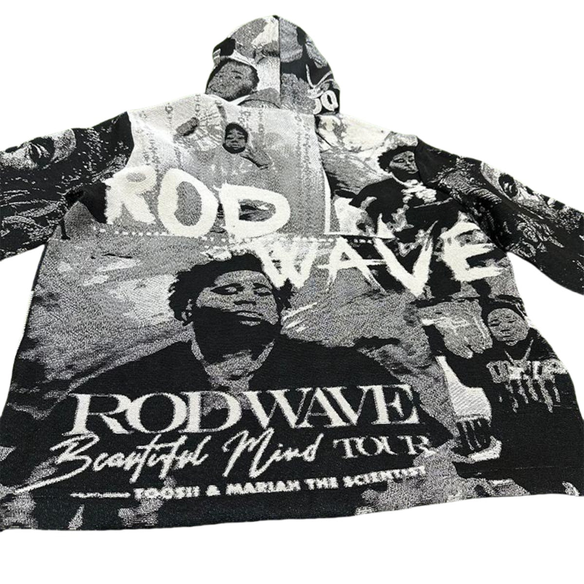 This black hoodie features a powerful woven tapestry graphic inspired by Christopher Wallace, known worldwide as The Notorious B.I.G., one of the most influential figures in hip hop history. The iconic imagery is rendered using premium jacquard weaving, giving the design depth, texture, and a striking visual presence against the dark base.