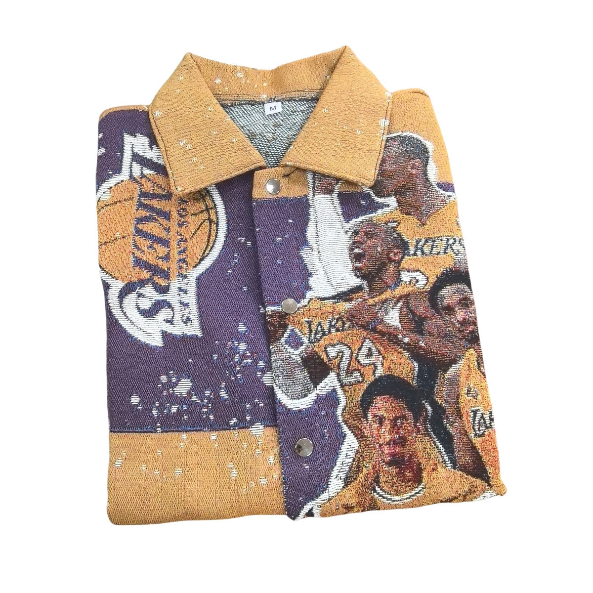 This vintage-inspired tapestry button-up shirt features a bold basketball graphic woven directly into the fabric using premium jacquard craftsmanship. Unlike printed shirts, the artwork is fully woven, delivering rich texture, depth, and long-lasting quality.